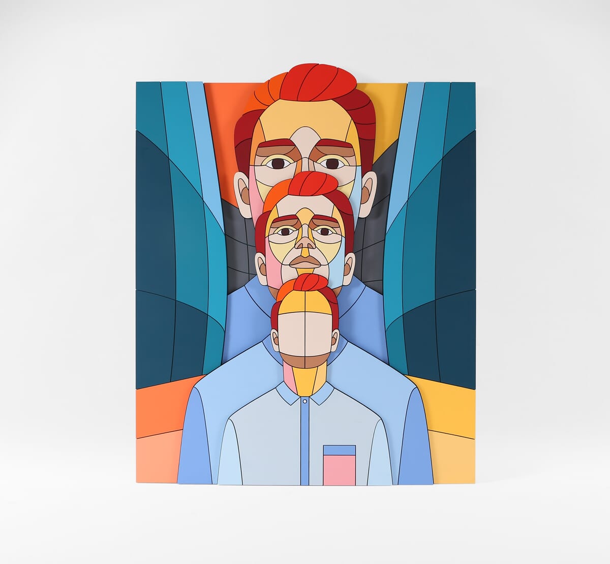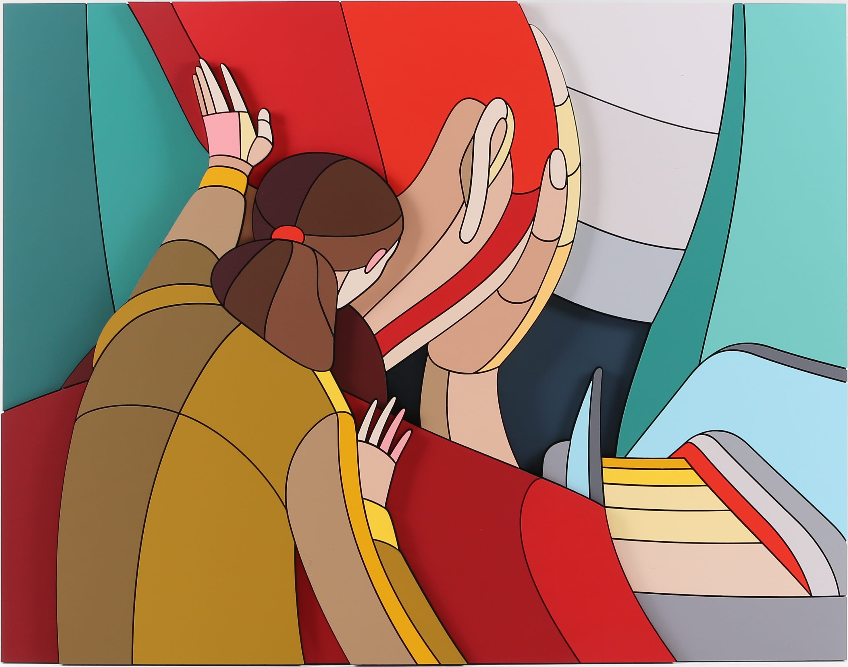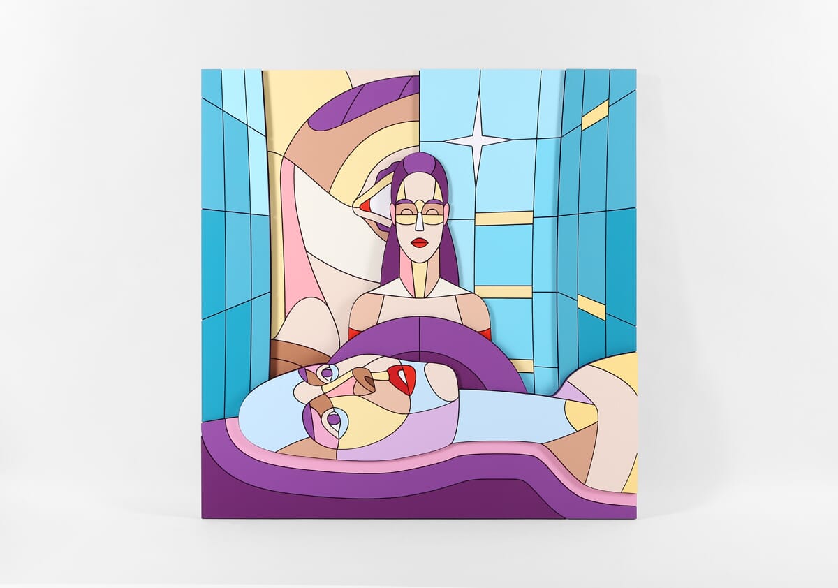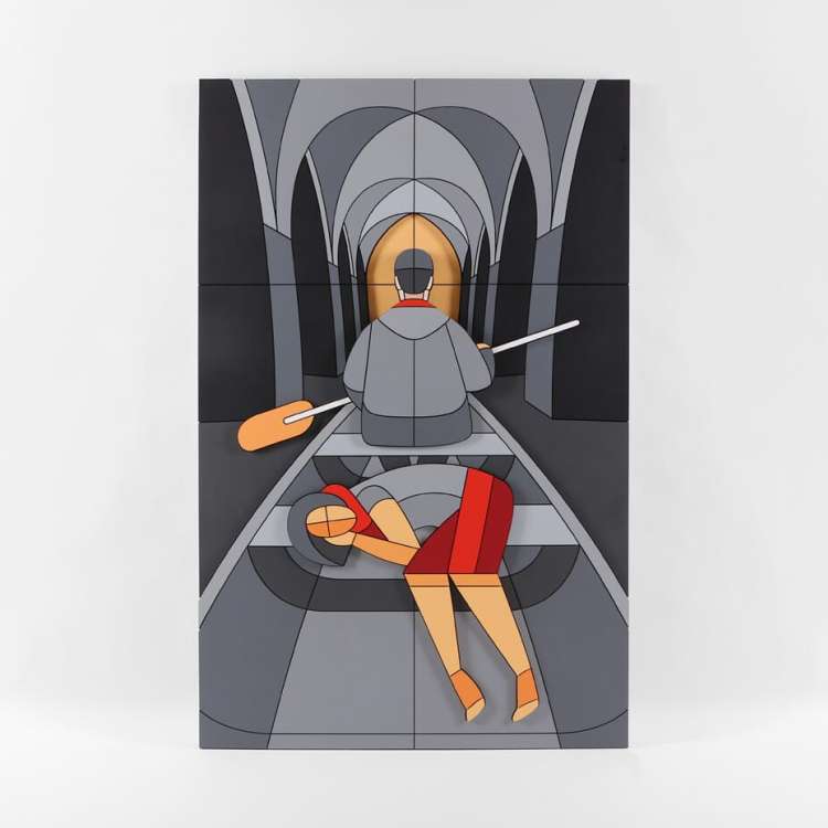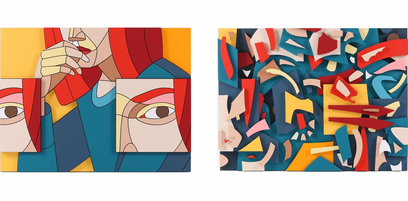 Часть произведений на выставке представляет из себя диптихи, собранные из одинаковых наборов фанерных деталей, где одна часть – фигуративное изображение, а другая — абстрактное. Превращая изображения в беспредметные композиции, Дмитрий Аске демонстрирует разбитую на множество частей картину мира современного человека, которую при желании он может собрать воедино, однако и этот образ может оказаться незавершенным.